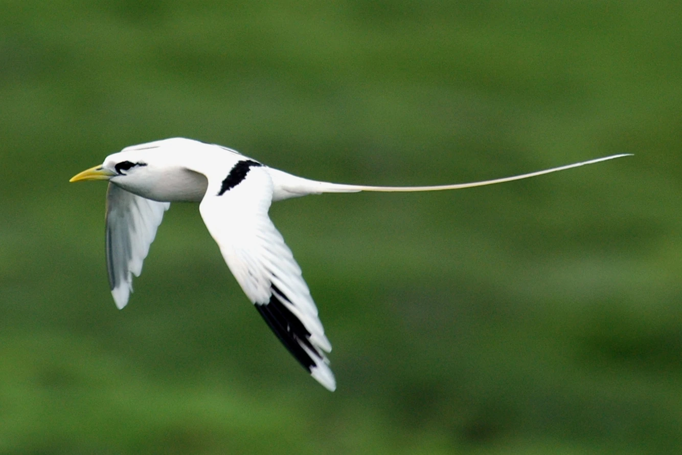 Mide cerca de 41 cm, sin contar las plumas extremas de la cola, con ellas llega hasta 81 cm. Envergadura de alas hasta 94 cm. Macho y hembra son similares. Tienen el cuerpo aerodinámico, se parecen a las gaviotas pero con un par de plumas largas blancas en la cola. El color dominante es blanco. Tiene una franja negra a la altura del ojo y dorsalmente en el ala extendida se le ve la punta negra y hacia la porción basal una franja diagonal gruesa negra. El pico es anaranjado. El inmaduro tiene en el dorso un barrado negro denso y el pico amarillo, careciendo de las plumas largas en la cola. Pueden verse solos o en parejas haciendo vuelos acrobáticos de exhibición sobre el área de nidificación. Promedian unos 16 años de vida. Se aparean a partir de los cuatro años de edad. Se alimentan zambulléndose desde alto y buceando en el mar para pescar peces, calamares y crustáceos.